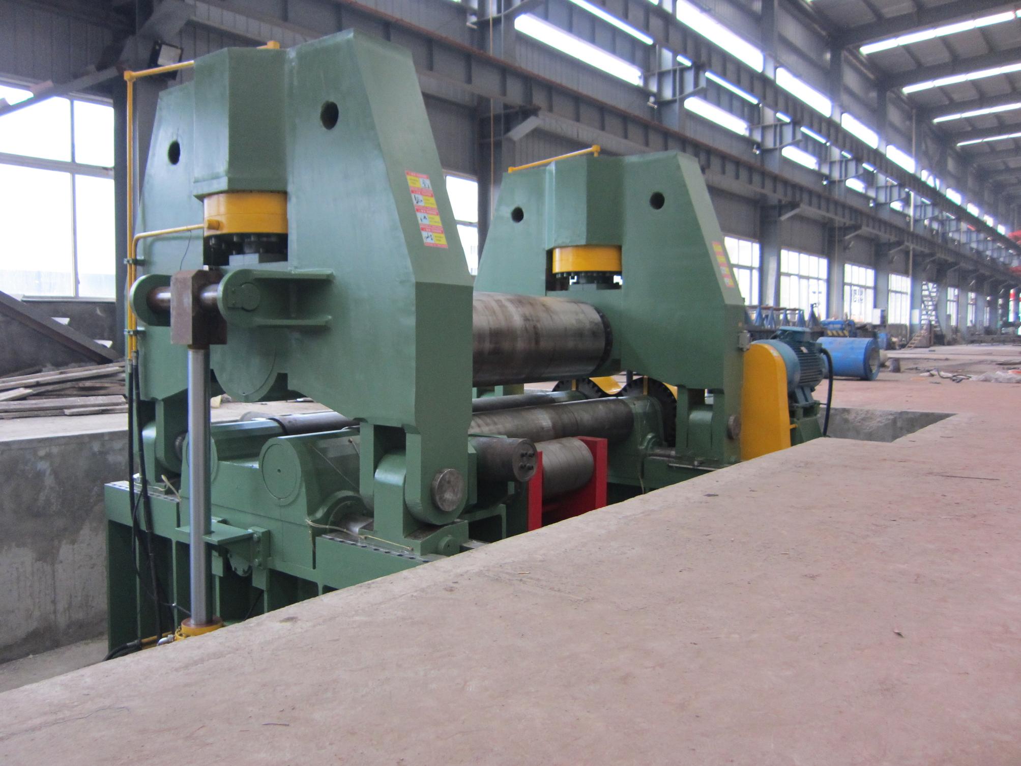T3SNC-12T3000W Plate Bending Machine is a kind of double pinch plate bending machine. The top roller is hydraulic driving. The top roller is vertically and horizontally adjustable, and the two lower rollers are fixed. All of the rollers in alloyed steel are induction hardening and heat treatment. All of the rollers will be grinded and polished after induction hardening treatment.